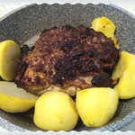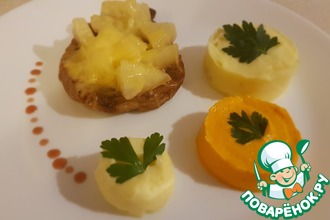 Выкладываем на противень. Я туда же положила сырой картофель, который предварительно намазала растительным маслом, посыпаем любимыми специями и отправляем в духовку на 1час 20 минут, запекаем при температуре 220*С.