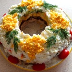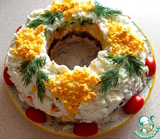 Украсить тонкой майонезной сеточкой, маслинами, кукурузой и петрушкой.