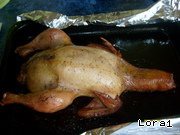 Бережно укладываем нашего куренка на противень с водой, накрываем фольгой и в духовку на 1 ч 20 мин,
