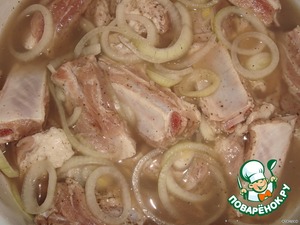 Замариновать рёбрышки: Уксус 3 ст. л., соль, перец, лук полукольцами. Маринуются в течениe 1,5 часов.