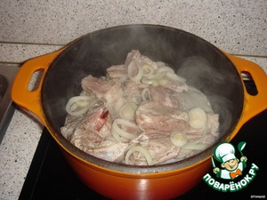 После того, как промариновались, обжариваем рёбрышки с луком в казане в течениe 20 минут, потом добавляем морковь, нарезанную соломкоЙ, и жарим ещё в течениe 20 минут!!!