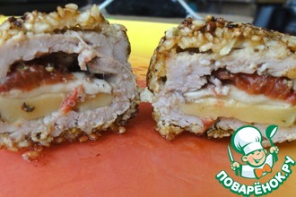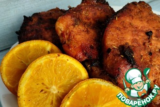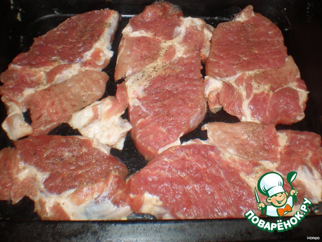 Куски свинины хорошенько отбить, обмазать специями и выложить на противень.