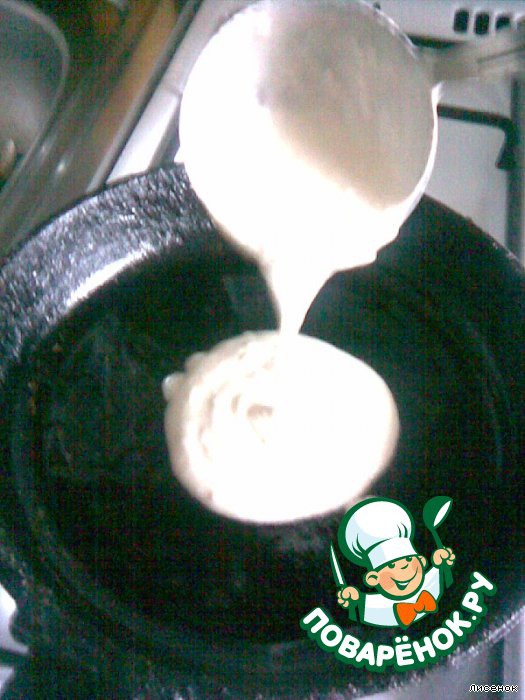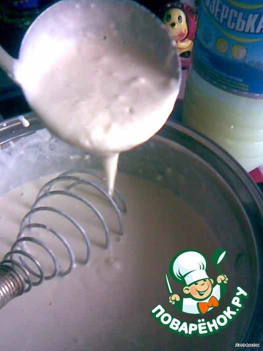 замесить из всех ингредиентов тесто(оно должно быть не жидким и не сильно густым,чтоб лилось с половника свободно)