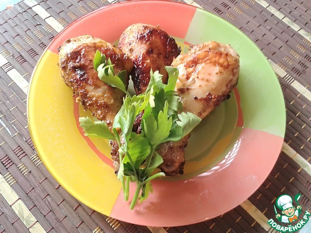 В тетрадке у меня написано печь 10 минут, поливая соусом, потом перевернуть и еще 10 минут печь. Я так заморачиваться не стала, соусом не поливала, не переворачивала, все и так прекрасно запеклось.
