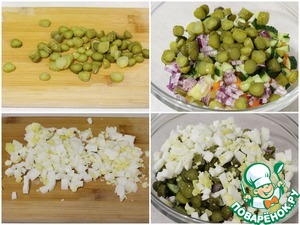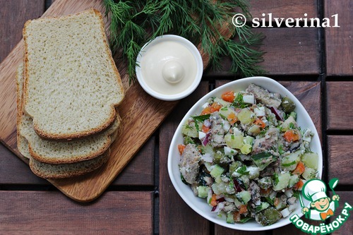 Если ставить на праздничный стол, то слоями делать, т.к. из-за рыбы в таком виде он заправленный получается не очень приглядный.