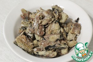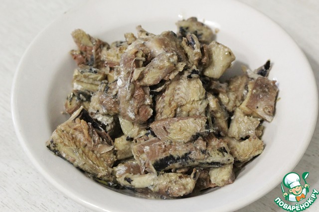 Рыбные консервы разобрать на кусочки, удалив косточки и слив жидкость.