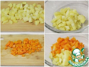 Картофель и морковь нарезать на кубики, сложить в глубокую миску.