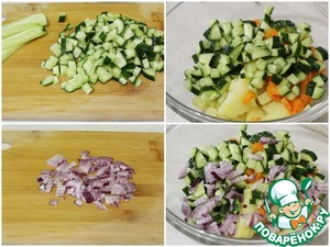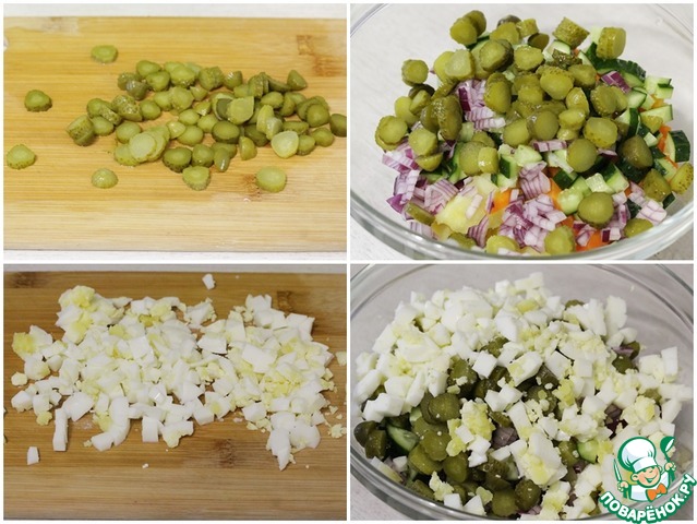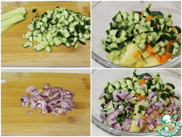 Свежий огурчик также нарезать на небольшие кубики (семена лучше убрать).