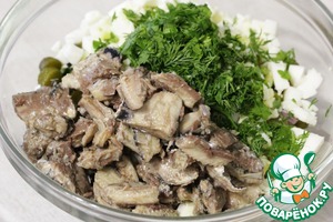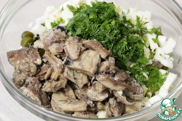 Добавить в салатницу кусочки рыбы и мелко нарезанную зелень, заправить майонезом.