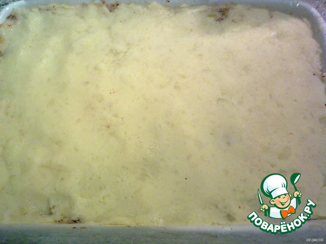 Из сваренного картофеля (ВСЮ воду слить) сделать пюре с добавлением 50 гр сливочного масла. Когда немного остынет, домешать 1 сырое яйцо так же толкушкой для картофеля (забыла сфоткать).