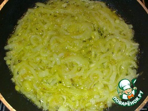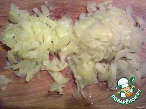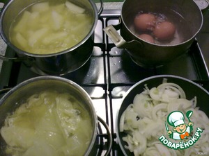 Картофель почистить и сварить в подсоленной воде. Капусту разобрать на листья и сварить с добавлением соли. Яйца (3 шт) сварить. Лук почистить, порезать полукольцами и обжарить на растительном и сливочном (пополам) масле.