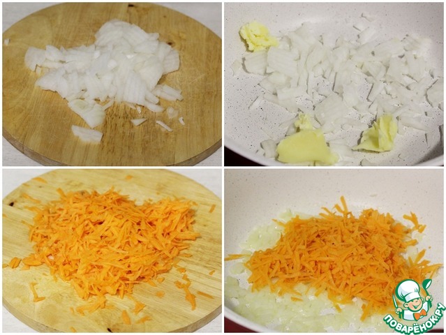 Лук мелко нарезать и спассеровать до прозрачности на растительном или топленом сливочном масле.