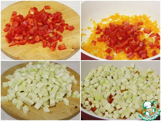 Сладкий перец нарезать на небольшие кубики, выложить его к луку и моркови, обжарить в течение минуты.