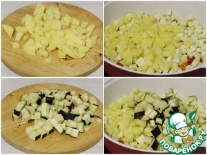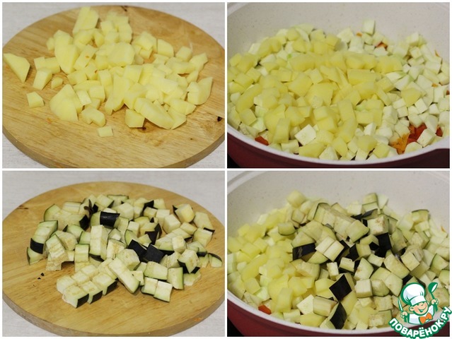 Молоденькие кабачки также нарезать на кубики и добавить к остальным овощам. -