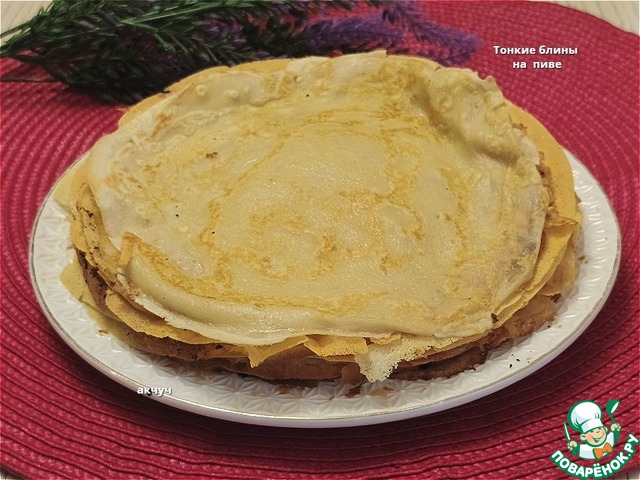 А эти блины на пиве я нашла на "Кукинге" в рецептах посетителей. Действительно, получаются весьма тонкие блины. Нам очень понравились. Отличные блины для несладкой начинки.