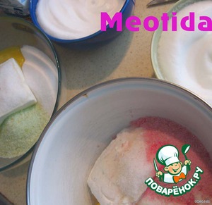 смешиваем 2 желтка, 400гр творога, 1/2 стакана сахара, желе(со вкусом киви), немного ванилина..........в отдельной миске взбиваем 2 белка