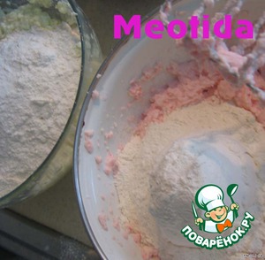 теперь в зеленую и розовую смесь добавляем по стакану муки и по 10грамм(по 1 пакетику) разрыхлителя, хорошо все перемешиваем