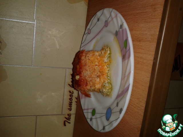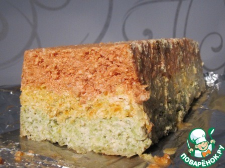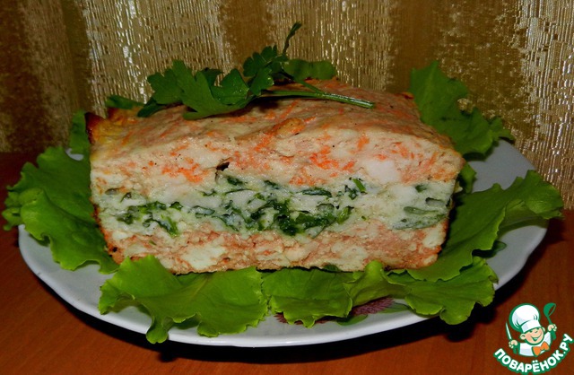 Сделала в одной форме, зелёный слой со шпинатом, добавляла манной крупы и молока для сочности, а также чесночка