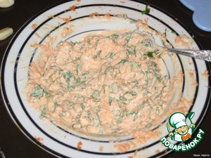 Начинка: морковь на мелкую терку, чеснок через пресс, зелень петрушки мелко порезать и заправить майонезом. (У меня осталась начинка от баклажанов, я добавила туда зелень петрушки).