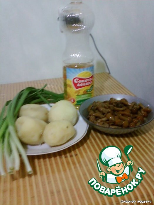 Порезать картошку и лук, смешать с грибами,посолить,поперчить и добавить растительное масло и перемешать.