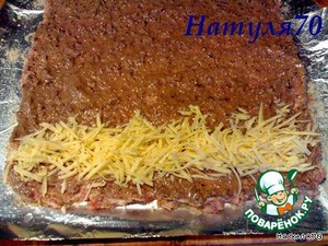 Через 20 минут достаем рулет, раскрываем и сверху посыпаем оставшимся сыром
