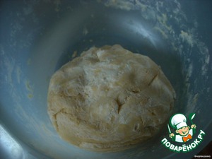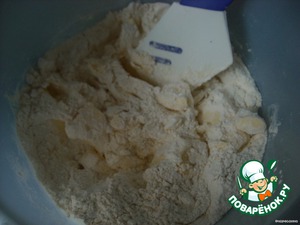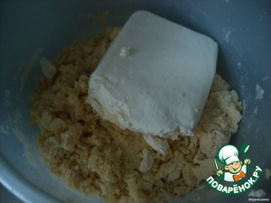 Готовим тесто: муку порубить с маслом в крошку, добавить творог, соль, замесить тесто, отложить в холодильник на 10 минут.