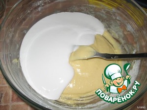 1/3 часть взбитых белков добавить к желткам, смешанным с мукой, и аккуратно перемешать, не круговыми движениями, а поднимая тесто слой за слоем, сверху вниз. Ввести оставшиеся белки и также аккуратно перемешать тесто сверху вниз.