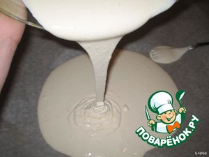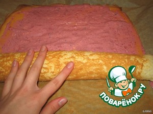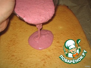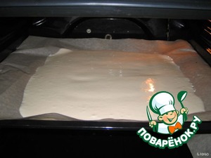 Тесто выкладываем тонким(!) слоем на противень, застеленный пергаментом или бумагой для выпечки и равномерно распределить по всему листу. Не забываем, что мы делаем рулет, слой теста не должен быть высоким.