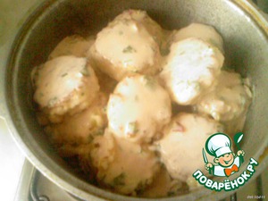 Далее вторым слоем выложим нашу прослойку. И так, чередуя, кладём слоями. Готовим заливку: Смешиваем майонез на заливку с соусом и зеленью петрушки для заливки. Желательно ещё добавить воды или молока так, чтобы вся заливка почти покрывала тефтельки.