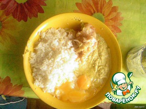 Всё высыпаем в куриный фарш. Кусочки батона пропитываем молоком и измельчаем. Добавляем туда отварной промытый рис,яйца, пропитавшийся батон и муку для фарша.Всё перемешиваем.