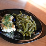 В принципе, к такому мясу гарнир не нужен - он уже имеется в виде шубки. Но сегодня я подала его с замечательным салатиком - свежая капустка, огурчики, помидорчики, зелень, лимонный сок, соль и растительное масло.