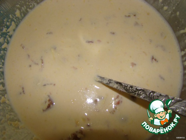 • В "тесто " (тестом назвать трудно Оно жидкое ну может типа блинного).. Добавляем сыр, купаты