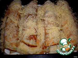 Рулетики полить сливками и посыпать сверху тертым сыром.