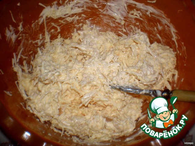 Сыр натереть на мелкой терке, смешать с майонезом.
