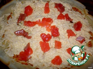 Далее, на блин намазываем сыр с майонезом и посыпаем сверху красной рыбкой.