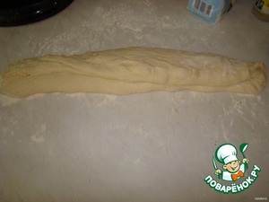 Сверните в два раза (Сворачиваем вдоль).. накройте салфеткой.. Оставьте минут на 10-15. Опять пришлепнули Затем сверните еще раз (Все время вдоль). Разрежьте пополам. или на 4 части.. Зависит от длины вашего противеня