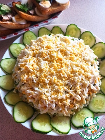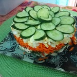 Тертые огурец и морковь слегка отжать, чтобы не было сока. Иначе слои держаться не будут, расплывутся.