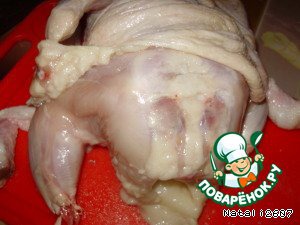 Курочку промыть и снять с нее кожу, оставляя только крылышки. Для того, чтобы снять кожу с курицы, нужно положить ее грудкой вверх, отрезать хвостик и аккуратно потихоньку руками отделять кожу от мяса, иногда помогая острым ножиком. Затем, переворачиваем курочку спинкой вверх и начинаем отделять кожу от спинки. Самое трудное место – это спинка курицы. Кожа здесь очень тонкая, легко рвущаяся, особенно, начиная от тазобедренных костей и ниже к хвосту. Лучше всего помогать себе острым маленьким ножом, но так, чтобы лезвие ножа скользило ( скребло ) по хребту, по костям и не касалось кожи.