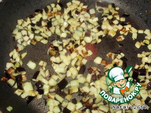 Нарезать кубиком баклажан, посолить и дать постоять минут 15-20, чтоб вышла горечь. Затем обжарить на сковороде с растительным маслом.
