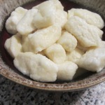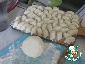 Насыпать на рабочую поверхность 2 ст. л. муки (или больше, если надо), разделить тесто на 3-4 части и скатать жгутики, из которых потом вырезать вареники. Я их вчера замораживала на доске