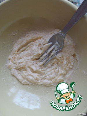 Добавить творог, яйцо и манку и замесить мажущее тесто, которое можно разминуть ложкой. А затем поставить тесто в холодильник (на 30 мин) для набухания манки