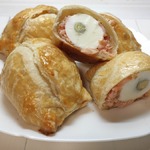 Каждое обернуть ломтиком рыбы, затем листом теста.