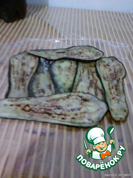 Перец запечь в духовке. Баклажан порезать, посолить и дать стечь горечи. Затем промыть и обсушить.