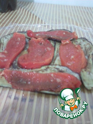 Взять кусок пищевой плёнки, выложить на неё баклажан, промазав чесноком.