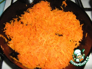 Морковь содержит витамины группы В, РР, С, Е, К, в ней присутствует каротин — вещество, которое в организме человека превращается в витамин А. Морковь содержит 1,3процента белков, 7 процентов углеводов. Немало в моркови минеральных веществ, необходимых для организма человека: калия, железа, фосфора, магния, кобальта, меди, йода, цинка, хрома, никеля, фтора и др. Морковку промываем под проточной водой, очищаем в новь промываем и натираем на тёрке. И слегка обжариваем.