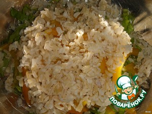 Добавить отваренный рис. У меня был отваренный бурый рис.