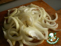 Мясо нарезаем полосками, добавляем к луку и перцу в сковороду, наливаем сок с противня и тушим 5 минут. Солим по вкусу. |