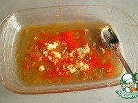 В емкость наливаем уксус, мед, перемешиваем. Добавляем растительное масло, чеснок, соус чили (или молотый перец), кумин и красный молотый перец. Все тщательно перемешиваем. |