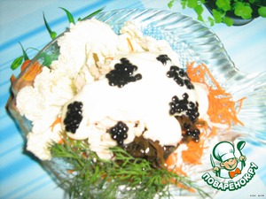 На порционную тарелку укладываем китайскую капусту в виде волн затем -морковь,китайскую капусту,морскую капусту,кальмар .Поливаем майонезом и украшаем икрой .