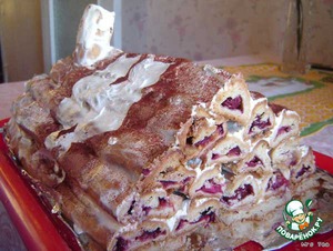 Из остывших бревнышек собрать торт. На корж-основу нанести слой крема, затем выкладывать 5, 4, 3, 2, 1 трубочки, каждый слой промазывая кремом. Получившуюся крышу обмазать со всех сторон кремом. Если остались вишни, то их можно положить в промежутки между трубочками. Готовый торт поставить в холодильник на ночь.